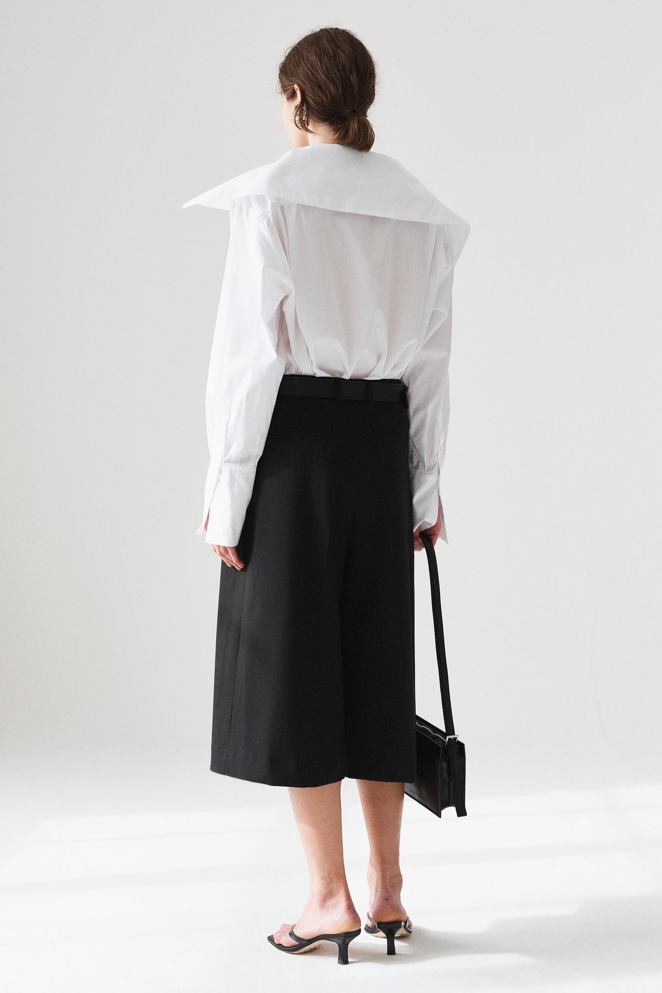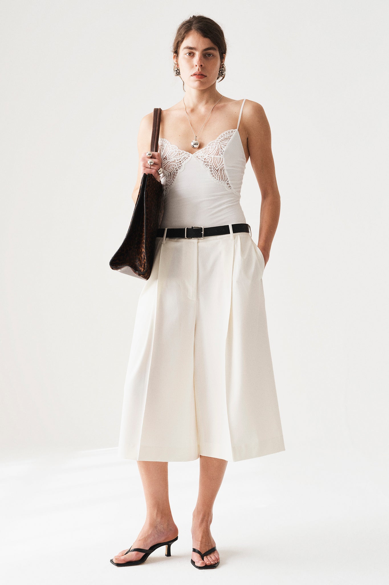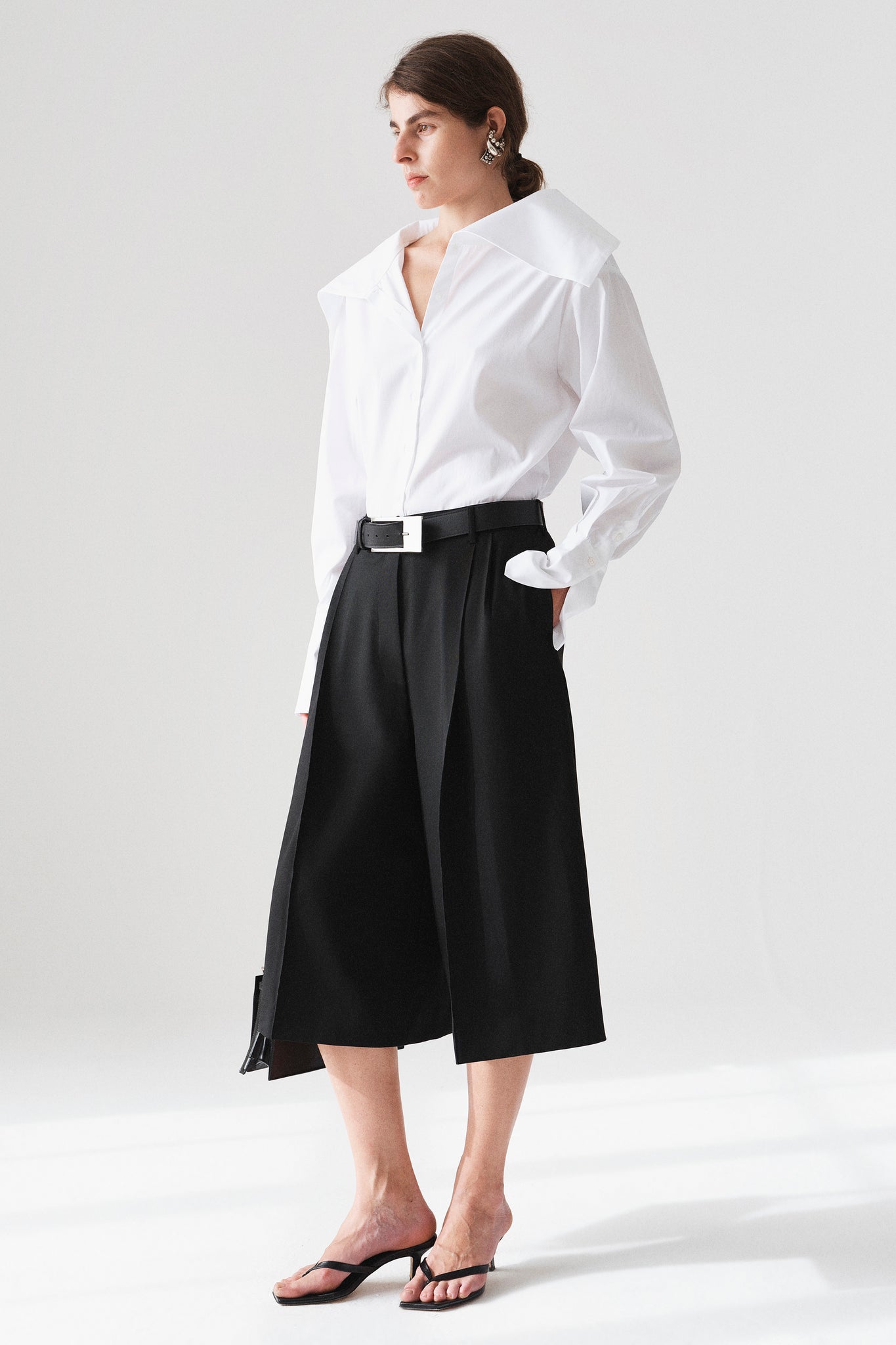 Borrowed from the boys, relaxed fitting wide cut culottes with a double knife pleat at the front. These culottes feature side seam pockets, back welt pockets, and belt loops.